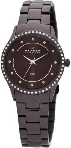 Shimmering Elegance. This women's Skagen watch comes in brown shiny stainless steel links and slim case with crystals made with SWAROVSKI ELEMENTS. The layered sunray brown dial has crystal indicators and three hands. Read moreReview Rating :